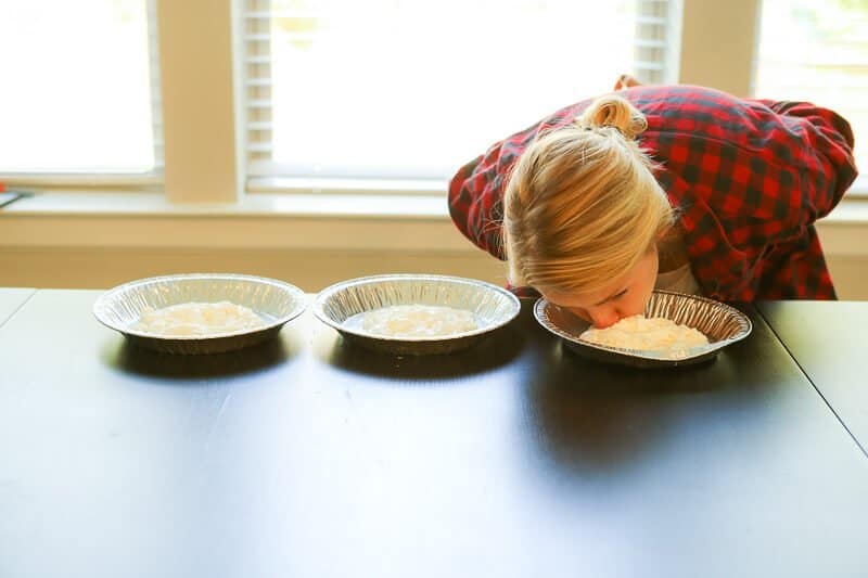 Supplies: Gummy ABC letters, pie tins, and spray whipped cream (or real whipped cream works too)