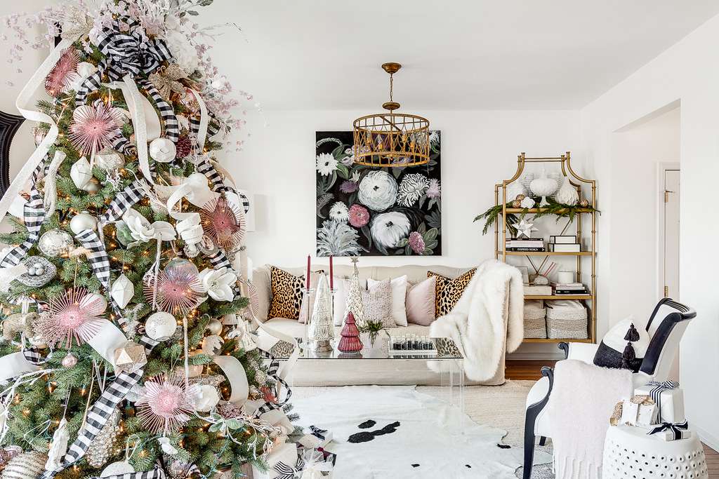 Tačiau norėdama, kad spalvingas, maksimalistinis medis atrodytų šiek tiek labiau surištas, dizainerė įgyvendina ypatingą apdailą: aplink medį apvynioja rožinį kaspiną. Tai darydama, ji paaiškina, kaip tai suteikia medžiui sanglaudos pojūtį ir daro jį labiau išbaigtą bei mažiau chaotišką.