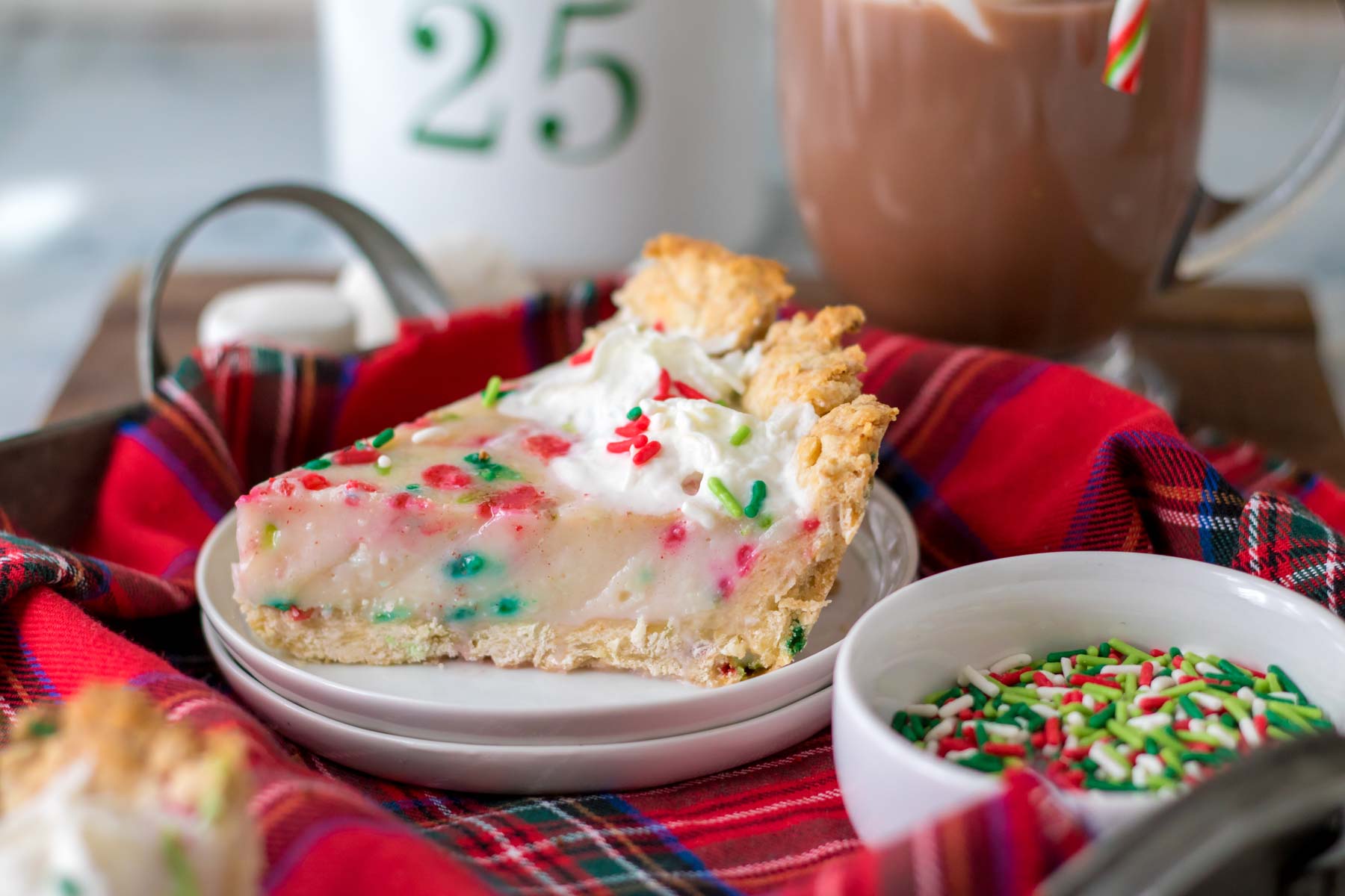 Šis kalėdinis grietinėlės pyragas su cukrumi yra skanus kreminis pyragas, papuoštas šventiniais pabarstukais, suteikiančiais šventinį prisilietimą. Klasikinis įdaras yra šilkinis ir sodrus, o dėl nesisukančios plutos puikiai tinka įtemptam atostogų sezonui.